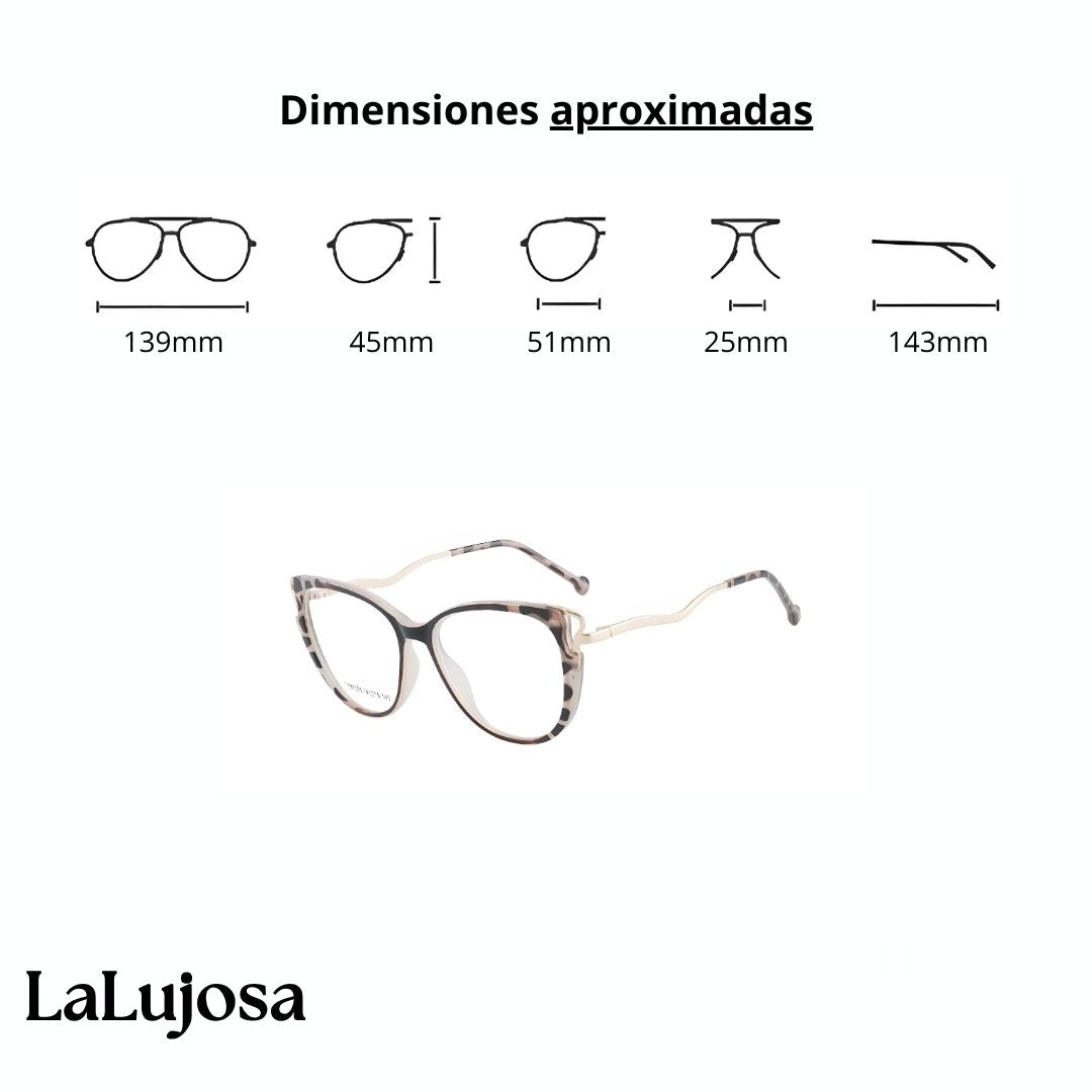 - Montura ojo de gato en leopardo beige con toques dorados, femenina y muy versátil.