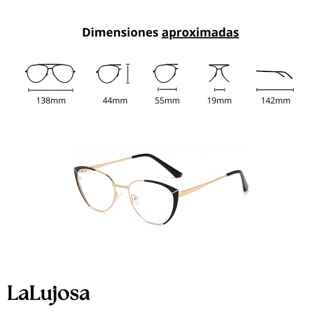 Resalta tu estilo con estos lentes ojo de gato en negro moderno. Su diseño elegante y chic complementa cualquier look, mientras que su protección contra luz azul cuida tu vista todos los días.