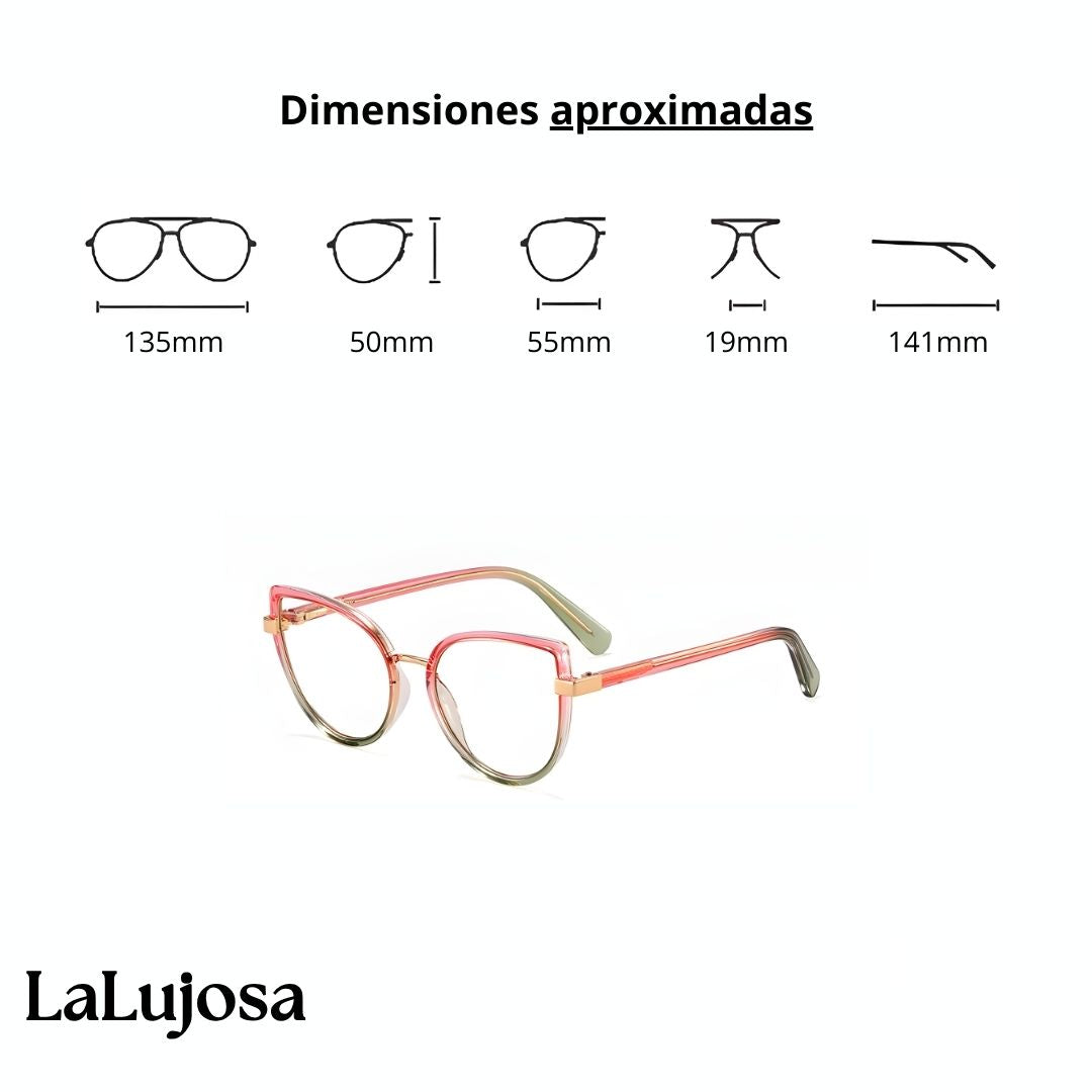 Lentes ojo de gato en tonos rojo y verde con un diseño actual y llamativo. Su montura ligera acompaña tu rutina diaria mientras protege tus ojos del uso constante de pantallas.