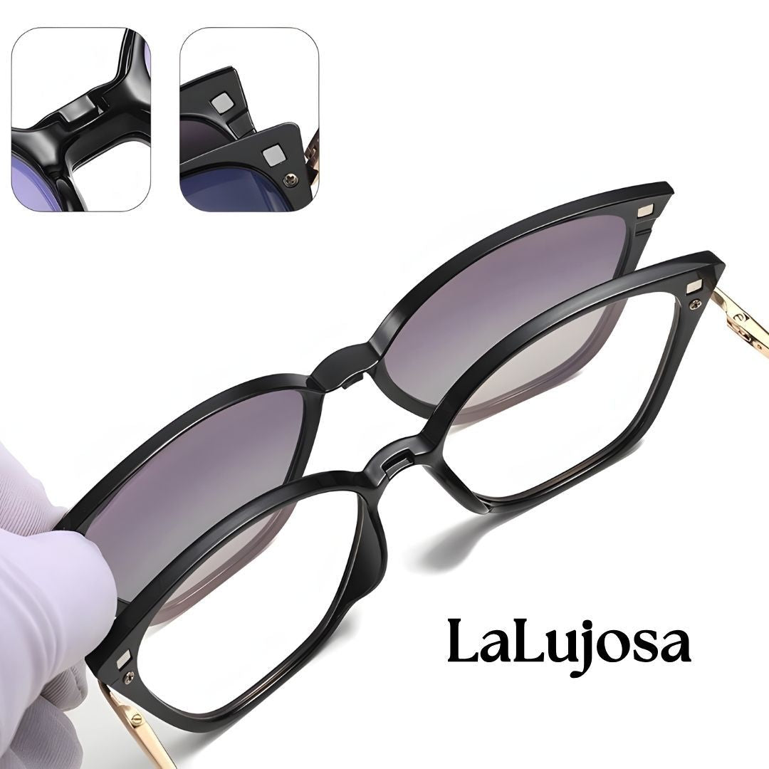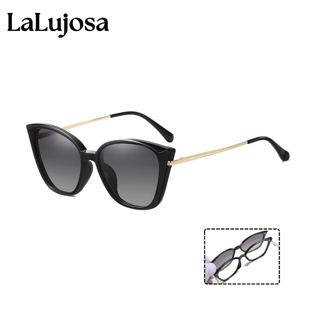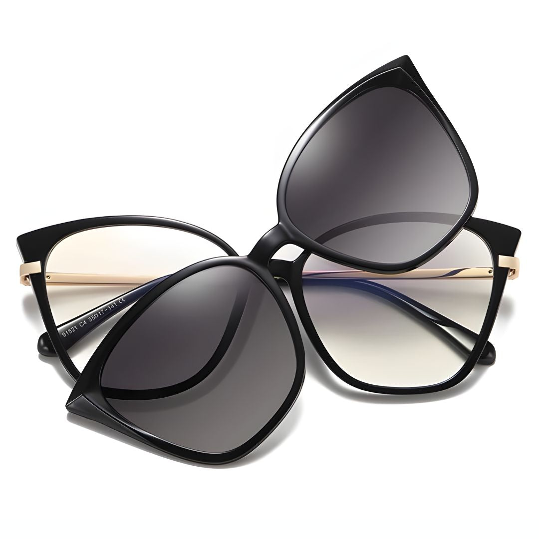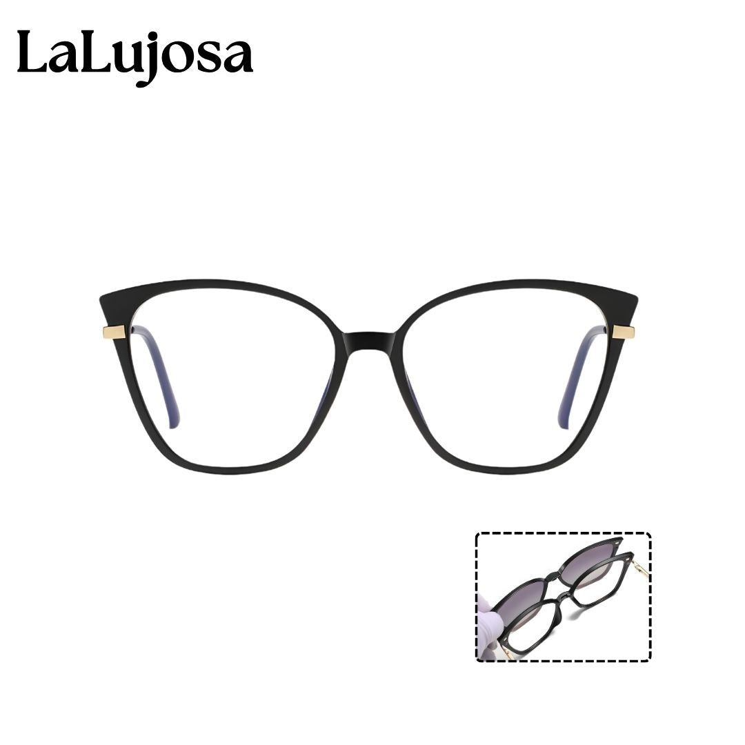 Luce increíble todos los días con las Lentes 2 en 1 Clip-On Ojo de Gato para Mujer en Negro Práctico. Su diseño moderno y versátil incluye lentes de sol clip-on que se colocan fácilmente cuando necesitas protección extra.