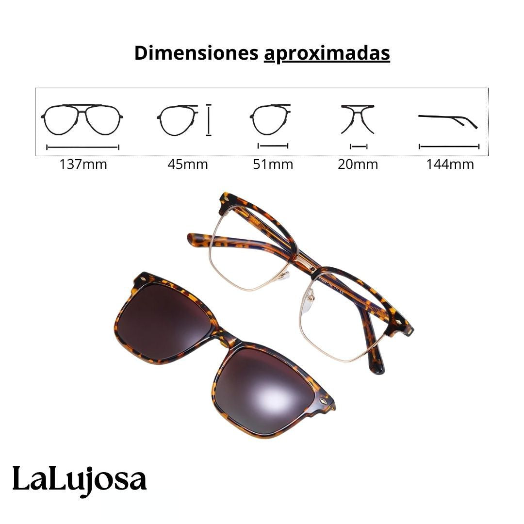 - Diseño versátil: Sistema Clip-On que permite acoplar las lentes de sol fácilmente, transformando tu look en segundos.